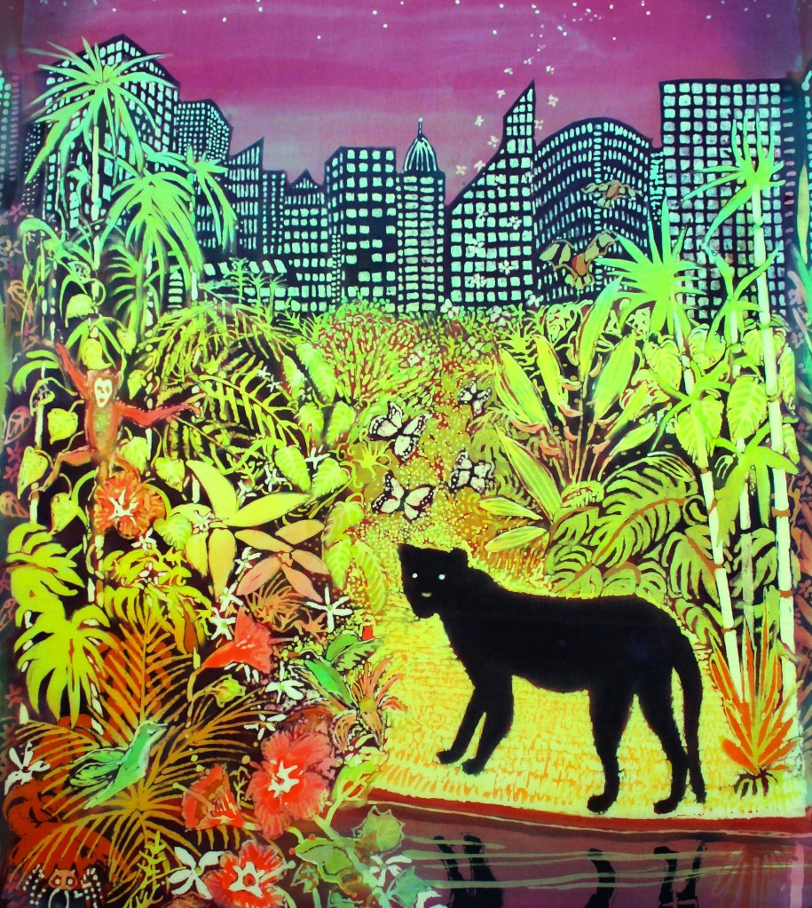 ‘Rewilding The City’ – batik on cotton (63 x 64 cm 2024) for ‘Patterns of Change’ an exhibition of batiks organized by Naples Botanical Garden, Florida, in partnership with The Batik Guild.exhibition at The Botanical Gardens, Naples, Florid 4 May-30 June 2024 The exhibition invited artists to show (in batik) how climate change had resulted in new patterns/behaviours.
